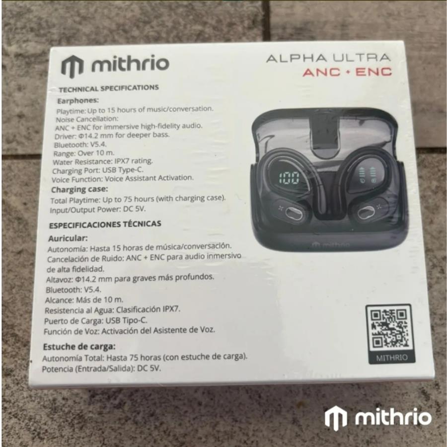 <p><strong>ESPECIFICACIONES TÉCNICAS</strong></p> <ul> <li><strong>Modelo:</strong> Mithrio Alpha Ultra</li> <li><strong>Bluetooth:</strong> Versión 5.4 (Última generación, conexión irrompible).</li> <li><strong>Resistencia:</strong> IPX7.</li> <li><strong>Carga:</strong> USB-C Rápida (1.5 horas).</li> <li><strong>Controles:</strong> Táctiles intuitivos.</li> </ul>